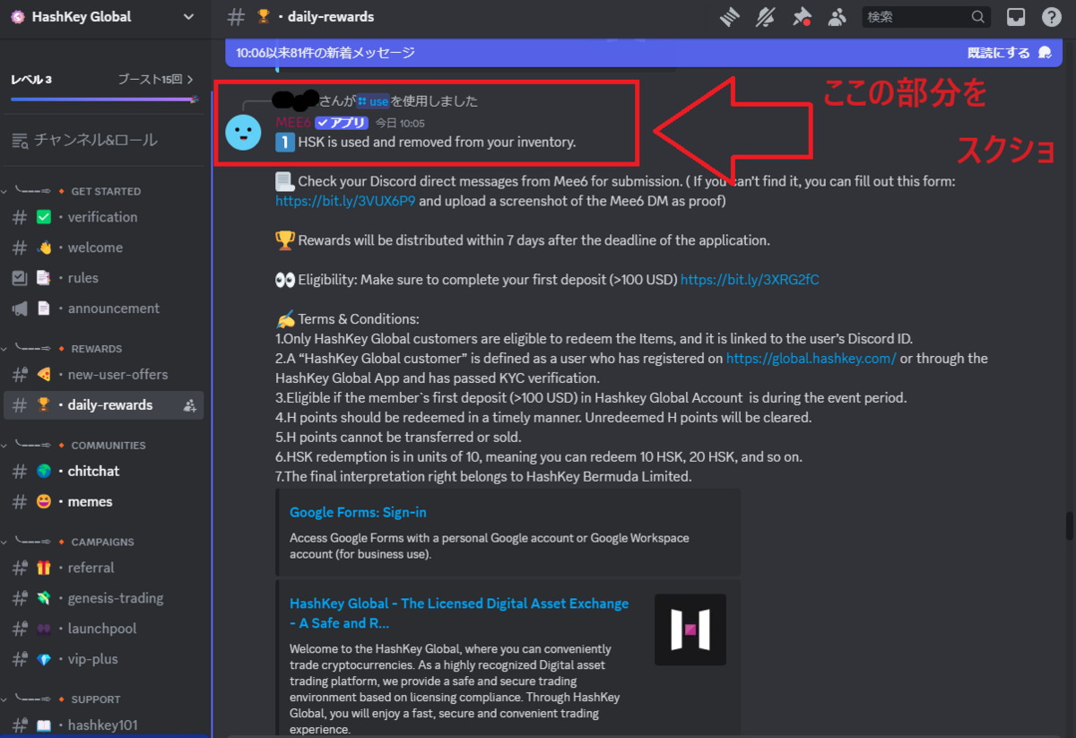 いよいよHSKを請求する段階です!Discordの「daily-rewards」チャンネルで以下の手順に従ってください:
