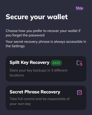 - 次に、ウォレットの回復方法を選びます。ここに「Split Key Recovery」と「Secret Phrase Recovery」があります。