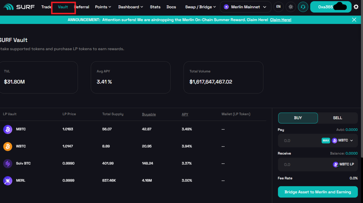 こんにちは、Merlinチェーンでエアドロ活動している皆さん!👋 今日は、Surf Protocolについてお話します。先に結論を言うと、私は結局このプロトコルへの参加を断念しました。その理由は単純で、最低預入金額が0.1 BTCからスタートするため、現在約$6,800もの資金が必要になるからです。