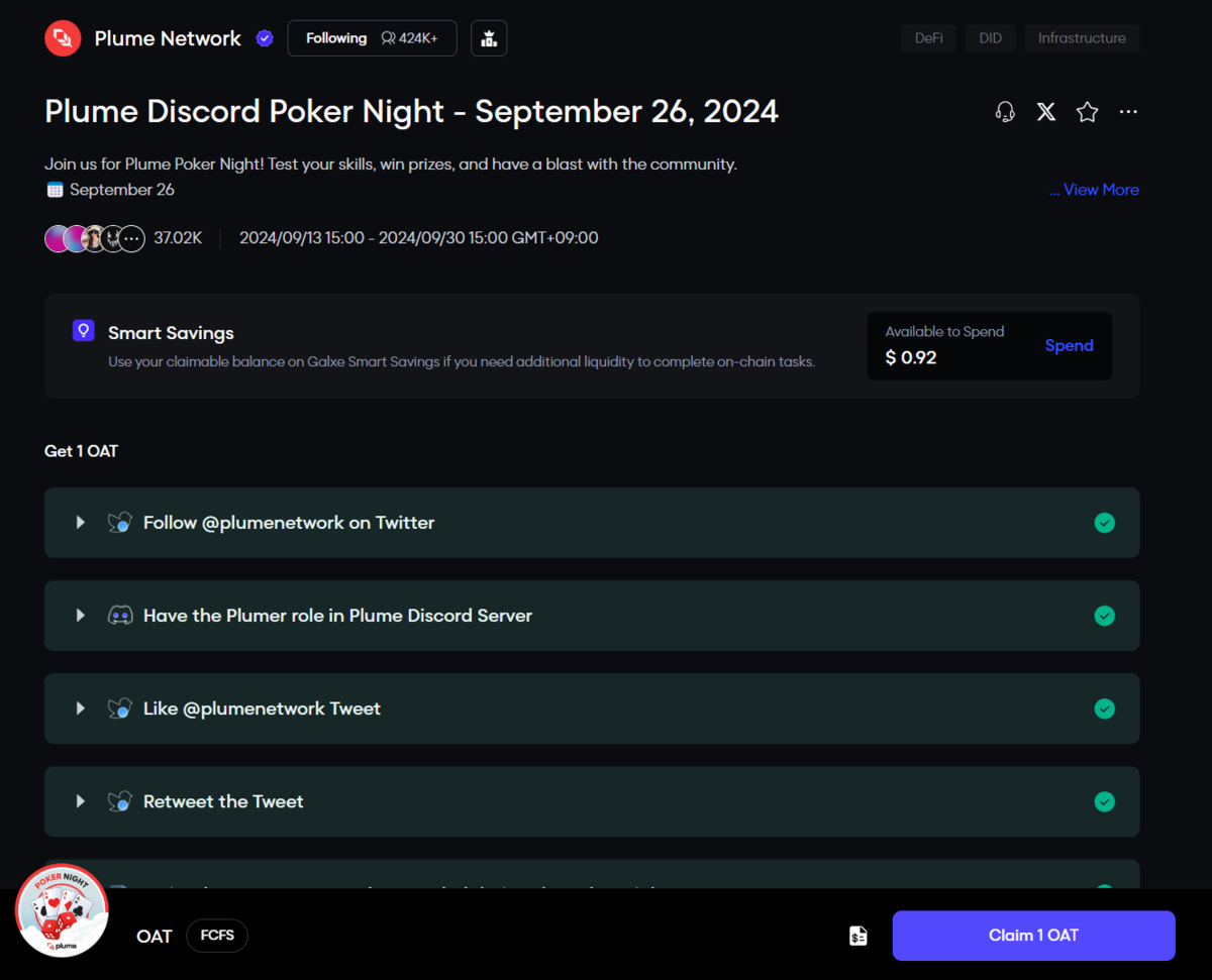 2024-09-28 🃏Plume : Galxe OAT獲得手順 Plume Galxeでクイズに答えるとOATが獲得できます。 📅 開催日: 2024年9月27日~9月30日(お早目に⌛) 参加リンク: https://app.galxe.com/quest/PlumeNetwork/GCUjutxDyE Galxeクイズ答え クイズの答え: Plume2thamoon
