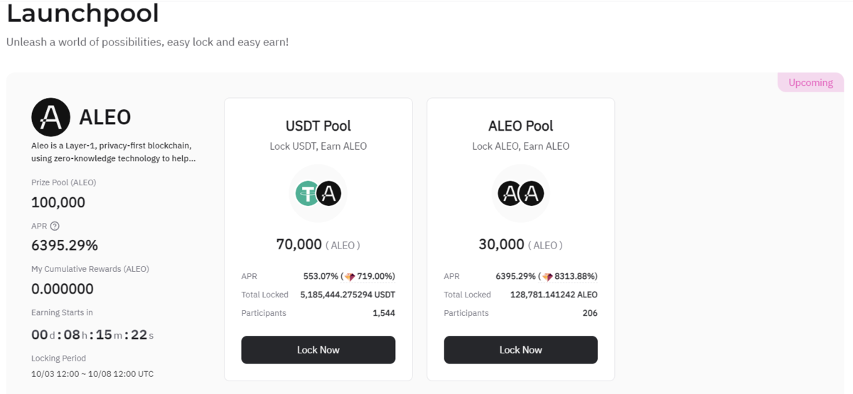 - USDTプール:最小10 USDT 〜 最大5,000 USDT(報酬:70,000 ALEO)