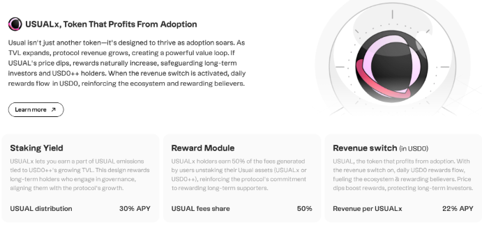 まずUSUALは、完全な流動性を持つネイティブトークンですが、それ自体ではガバナンス権や経済的権利は持ちません。一方、USUALをステーキングして得られるUSUALx(LST)は、ガバナンス権と経済的権利を兼ね備えたトークンとなります。USUALをUSUALxに変換することで、プロトコルの成長に伴う様々な特典を享受できます。✨