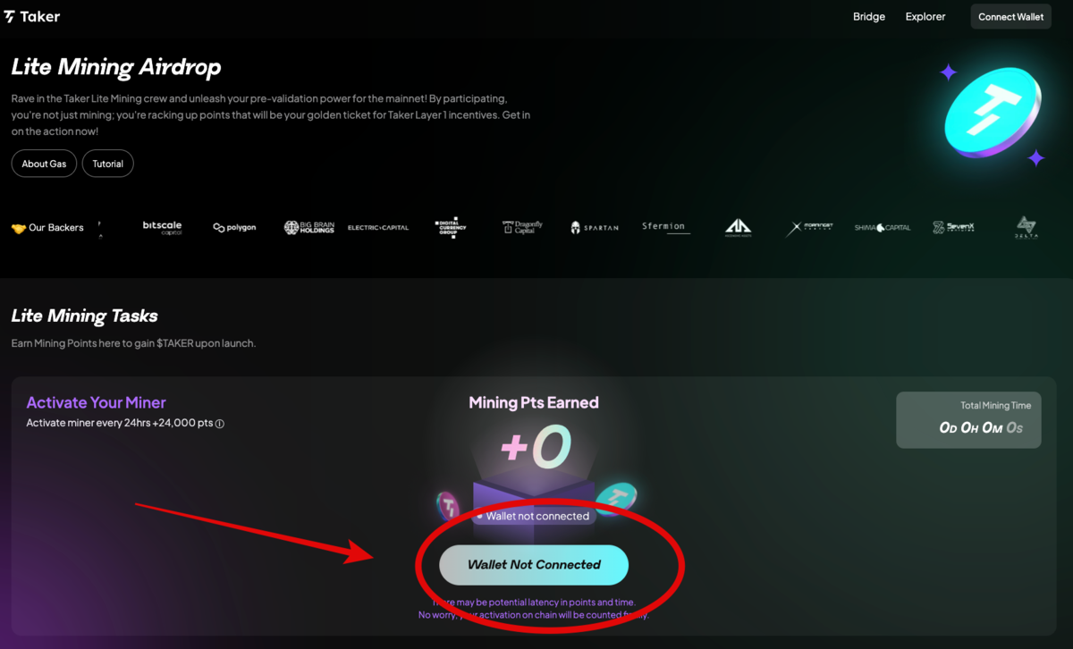 こんにちは😊ビットコインの可能性をさらに広げる注目のプロジェクト、Taker Protocolはご存知でしょうか。Electric、DCG、Dragonflyなど大手VCが支援してます。ライトマイニング(エアドロップ活動)の参加方法を共有します!✨