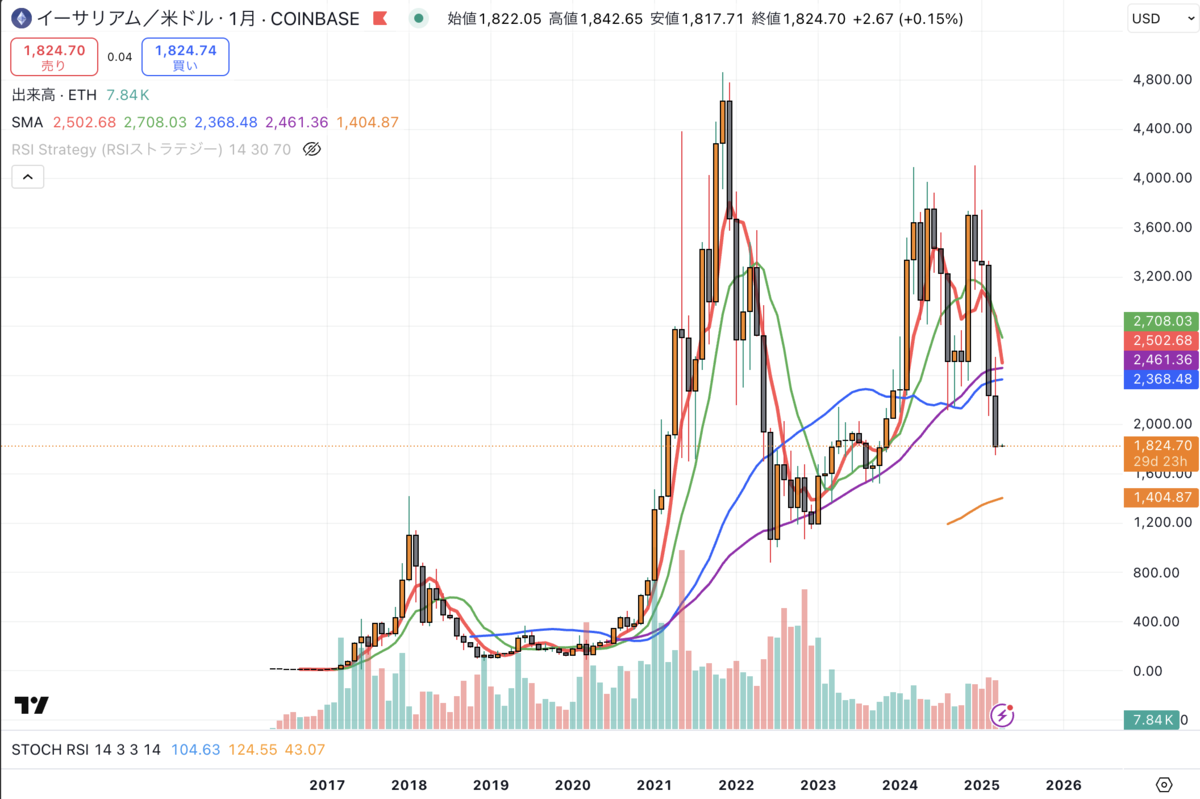 - 📉 3月も下落で1,824ドル付近で確定。ビットコインと比較して相対的に弱い動き