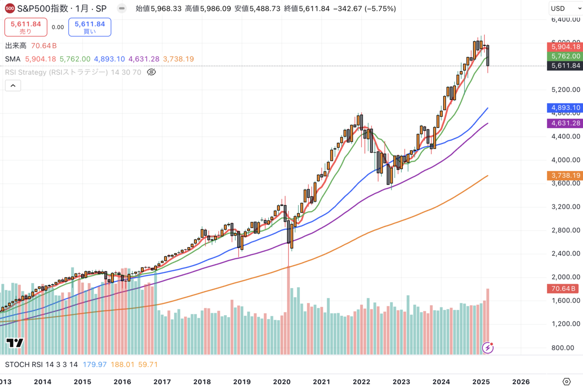 - 🔻 3月は大きな陰線で終了し、5,611ポイント付近で確定(前月比-5.75%)